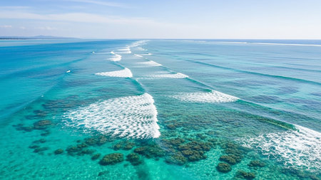 Dramatic aerial shot of white ocean waves breaking over a vivid coral reef, highlighting the dynamic interaction between sea and marine ecosystem.