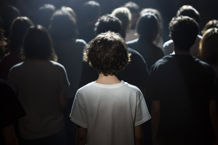 Emotional scene of a small, frightened child standing alone in a crowd of adults, illuminated by a dramatic spotlight symbolizing isolation.