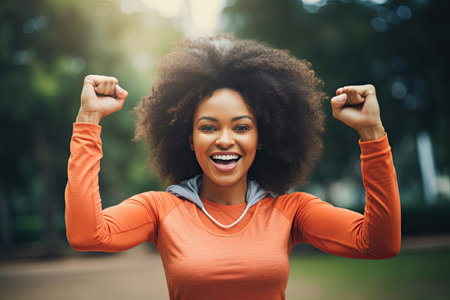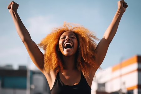 shot of a young woman with her arms raised in celebration, created with generative ai