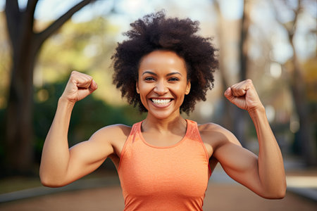 A joyful young Black woman flexes her biceps, radiating confidence and strength against a vibrant blue sky dotted with fluffy clouds. Her bright smile and athletic attire embody empowerment and positivity, inspiring others to embrace their fitness journey.
