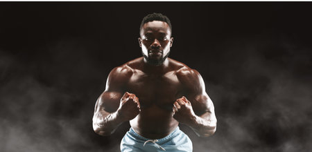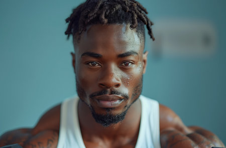 A confident African American man stands with his arms crossed against a textured gray wall. He exudes strength and determination in a casual athletic style, reflecting a powerful lifestyle and focus on fitness.
