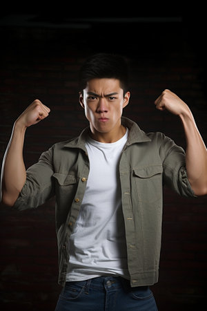 A close up shot of a man's muscular arms, with his biceps flexed and fists clenched, showcasing strength and determination.