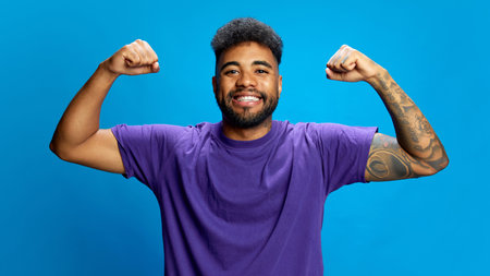 Young man in purple shirt smiling warmly. His arms raised, showing off his strength with flexing pose against vibrant blue background. Concept of human emotions, youth, social media, fashion and style