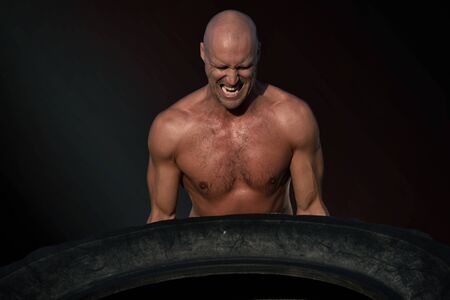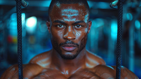 Passionate male athlete showing raw energy and determination during intense workout in gym with dramatic lighting and powerful expression of strength