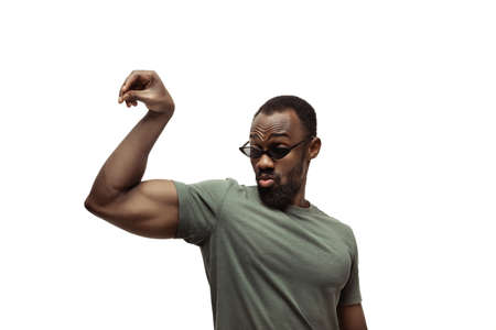 Close up portrait of a happy african american man wearing t-shirt flexing bicep arm muscle