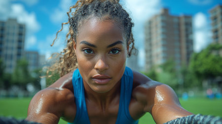 Focused athlete training outdoors during a sunny day, showcasing determination and strength in the moment of exercise. Generative AI