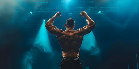A muscular bodybuilder celebrating victory by raising both hands in the air showcasing his strength and leadership. Concept Strength and Victory Celebration, Bodybuilder Poses, Muscular Achievement