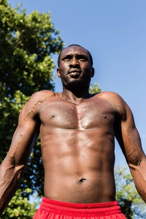 Athletic black man doing workout in a city park. Concept of healthy lifestyle.