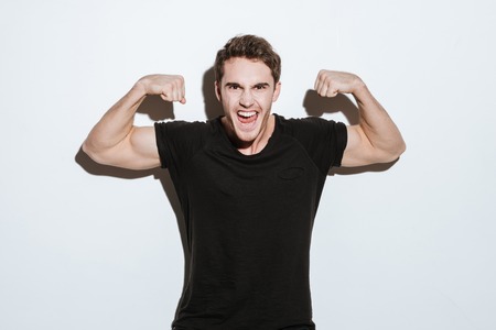 Picture of screaming young man dressed in black t-shirt posing over white background looking at camera. Showing biceps.