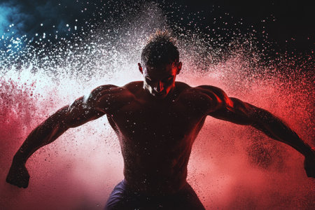 A strong athlete showcases muscles in a powerful pose surrounded by colorful smoke effects at night.