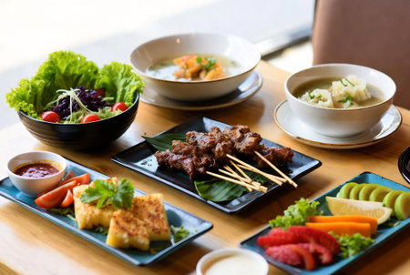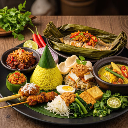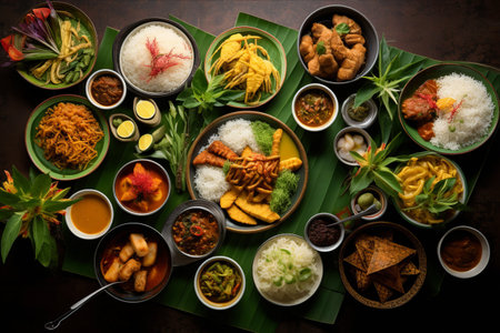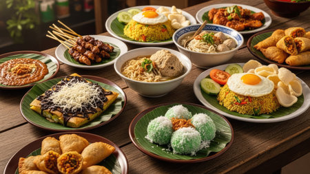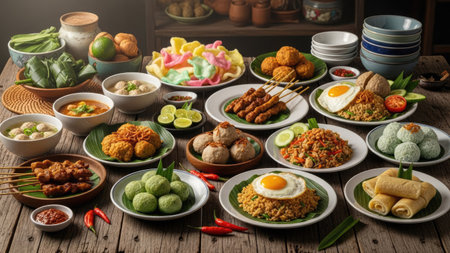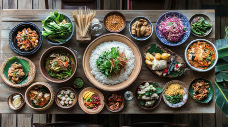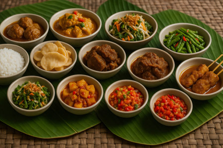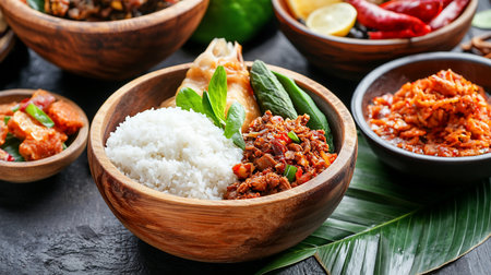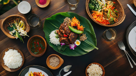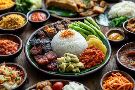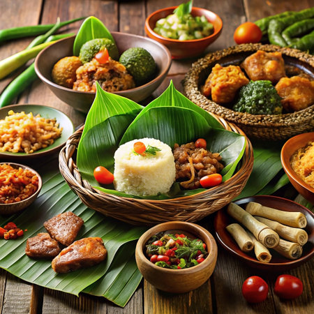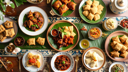 Diverse Indonesian cuisine spread on wooden table. A feast of various dishes, including rice, curries, vegetables, and meats, served in bowls and on banana leaves
