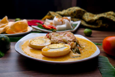 Coconut milk gravy filled with eggs, tofu, peanuts, sliced papaya with rice cake and chili as the background