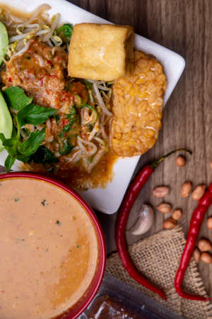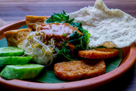 Pecel is Indonesian traditional food made from mixed vegetables served with peanut sauce, tofu, tempeh, tofu and white cracker
