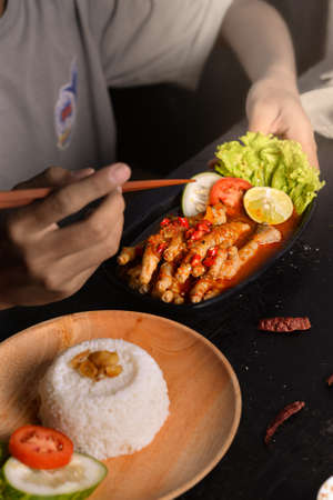 Ponorogo, East Java, Indonesia on April 3, 2021. Chicken claw type food with a spicy and delicious taste introduces its sales product. Sellers create catalogs by documenting them to attract buyers' at