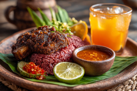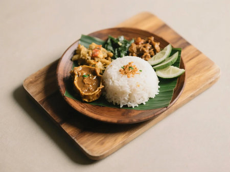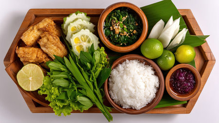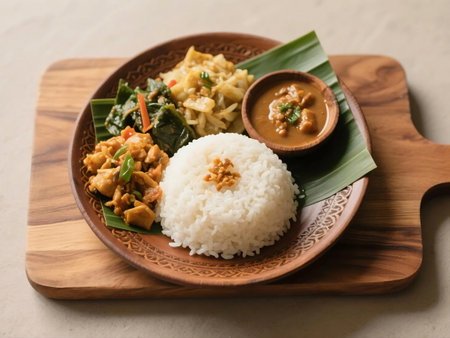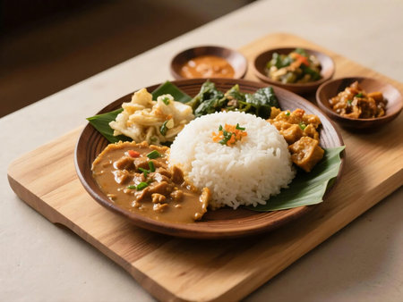 Top down view of traditional Indonesian rice meal with curry, side vegetables, and sambal, served on a wooden tray with banana leaf and wooden spoon. Perfect for Asian food and culinary themes