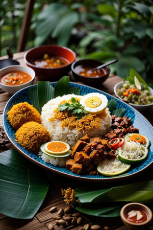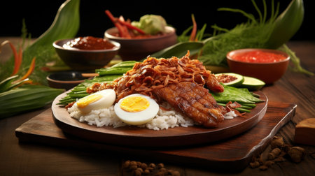 Delicious Malaysian Nasi Lemak on Wooden Table AI Generated