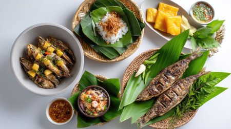 Experience a delightful arrangement of freshly cooked traditional delicacies featuring grilled fish, fragrant rice, and vibrant sauces, artfully presented with green leaves.