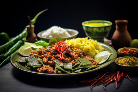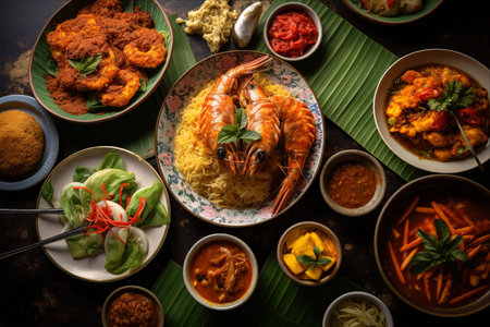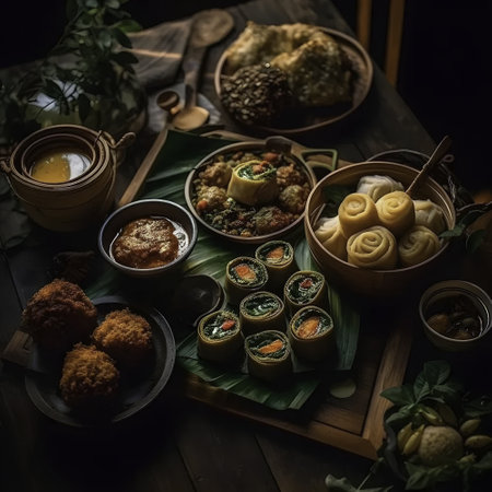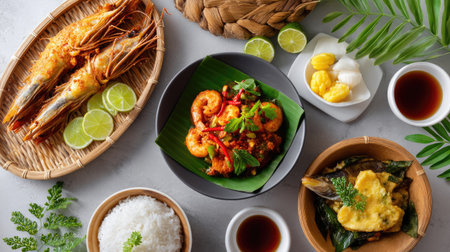 A delectable spread of traditional Asian dishes, artfully presented on rustic wooden and woven surfaces, adorned with fresh banana leaves. This image evokes the rich flavours, cultural heritage, and diverse culinary traditions of Southeast Asian cuisine, perfect for food, travel, and cultural content.
