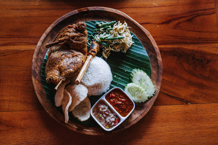 A wooden plate of deep-fried duck with rice, vegetables, chili and crackers. Bebek goreng. Flat lay or top view. Indonesian dish.