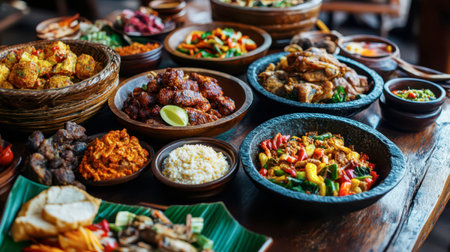 A beautifully arranged spread of various traditional dishes on a wooden table, showcasing the rich flavors and vibrant colors of local cuisine, perfect for sharing.