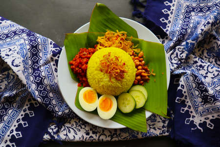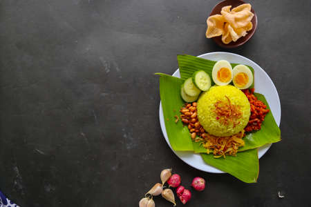 nasi kuning or yellow rice or tumeric rice is traditional food from asia, made rice cooked with turmeric, coconut milk and spicesserved with egg, chicken, peanuts, chili sauce, sliced ​​cucumber