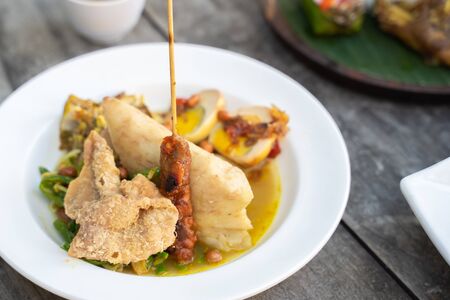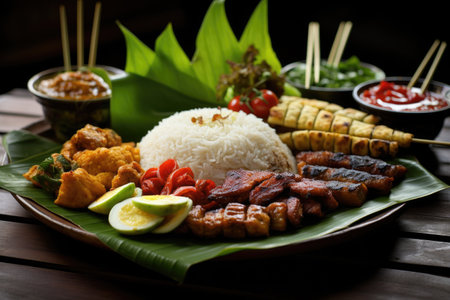 Rice with grilled pork and vegetables on wooden table, Thai food, Indonesian traditional bali food. Indonesia, AI Generated