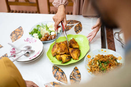 hand preparing food on dining table. traditional indonesian food