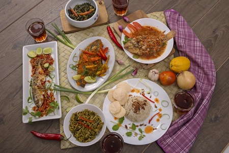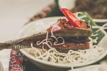 Thai traditional food in a basket on wooden table, selective focus