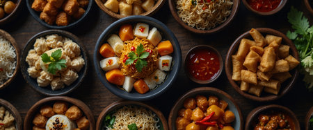Various plates display diverse food items, including rice, noodles, and fried snacks. The composition shows multiple dishes, with diverse colors and textures, captured under warm lighting. Suitable for culinary promotions or editorial projects focused on food and dining themes.