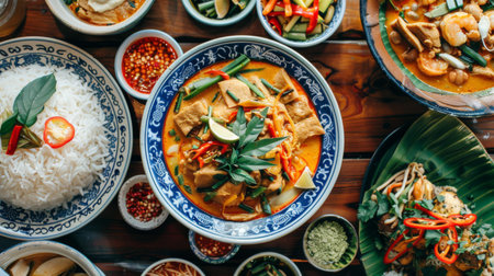 Overhead shot of a traditional Thai family-style meal with various curry dishes, served with jasmine rice