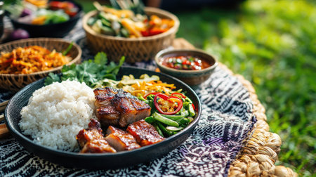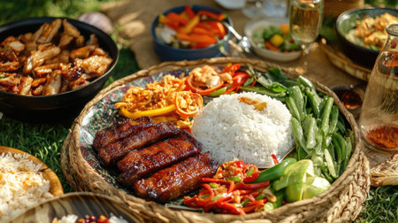 A vibrant outdoor picnic spread featuring grilled dishes, rice, fresh vegetables, and colorful sides, perfect for gatherings and celebrations.