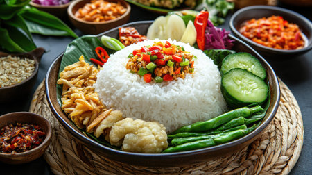 A close-up view of Nasi Campur, a popular Indonesian dish, featuring white rice, various side dishes, and fresh vegetables, presented in a traditional wooden bowl.