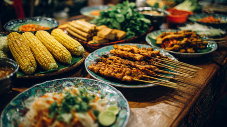 Discover a vibrant culinary scene with expertly grilled skewers, fresh corn, and herbs laid out on beautiful traditional plates, perfect for gatherings.