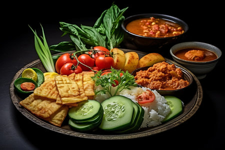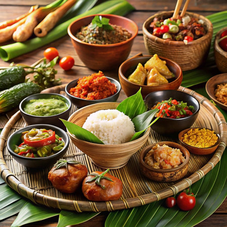 Diverse array of Southeast Asian dishes served on a traditional bamboo tray. Various curries, rice, and accompaniments
