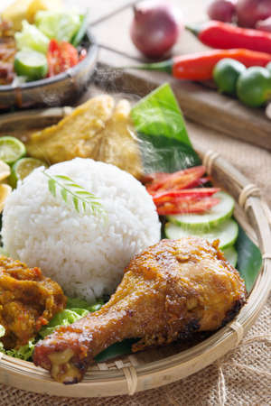 Popular delicious Indonesian local food nasi ayam penyet, indonesian fried chicken rice with sambal belacan. Fresh hot with steam smoke.