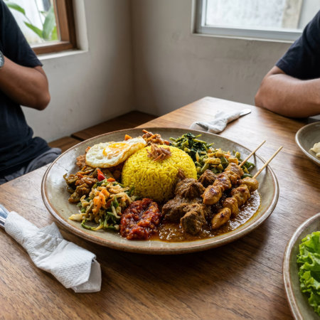 An abundant platter of authentic Indonesian Nasi Campur, featuring vibrant yellow rice, savory beef rendang, grilled satay, and a sunny-side-up egg on a rustic wooden table.