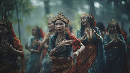Group of graceful dancers in vibrant traditional costumes performing a captivating dance, showcasing rich cultural heritage and artistry in warm light.