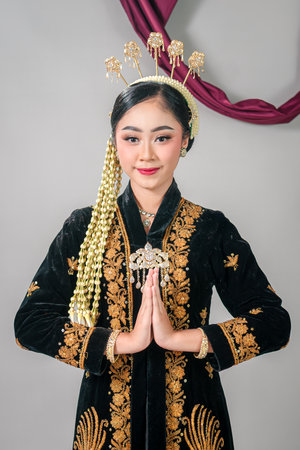 Asian woman in traditional Javanese attire poses with a polite smile and graceful hand gesture, expressing warmth, elegance, and cultural pride in a formal portrait.