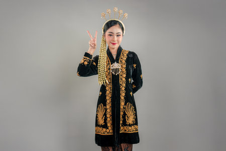 Cheerful young Asian woman in traditional Javanese attire smiling confidently while showing a peace sign. Her joyful expression radiates charm, warmth, and cultural pride.