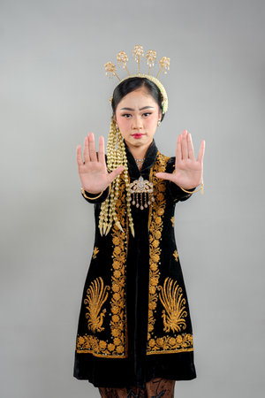 Asian woman in traditional Javanese attire makes a double hand stop gesture with a serious face, expressing rejection, warning, and confidence in cultural elegance.
