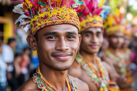 A vibrant scene showcasing enthusiastic dancers wearing colorful traditional costumes. Their joyful expressions reflect cultural celebration and artistic heritage.