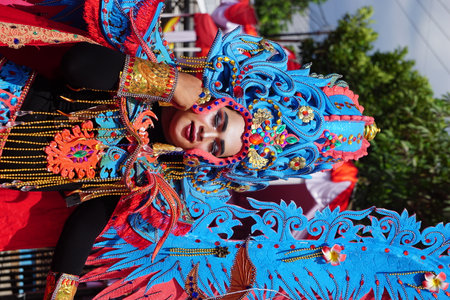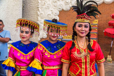 DENPASAR, BALI ISLAND, INDONESIA - JUNE 11, 2016: Beautiful woman dancer in bright traditional costume. Balinese people dancing on street parade at art and culture festival.