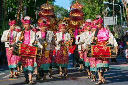 Denpasar, Bali island, Indonesia - June 11, 2016: Young musicians dressed in ethnic Balinese people costumes play traditional orchestra music at ritual temple procession at street of Denpasar