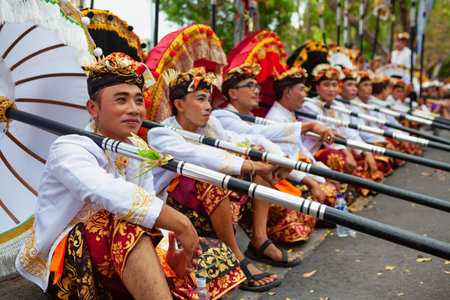Bali, Indonesia - June 23, 2018: Group of young dancer men in ethnic costumes with traditional red, black and yellow umbrellas on hindu ceremony parade during temple festival. Balinese people culture.