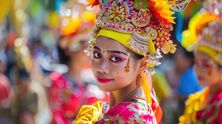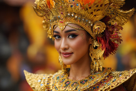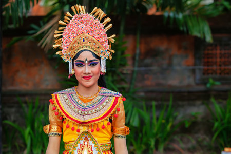 Denpasar, Bali island, Indonesia - June 23, 2018: Face portrait of beautiful young woman in traditional Balinese dance costume with golden headdress on street parade at art and culture festival.