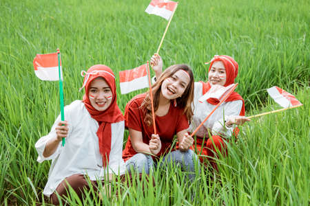 three Asian girls smile posing hold a small flag sitting in the middle of rice fields