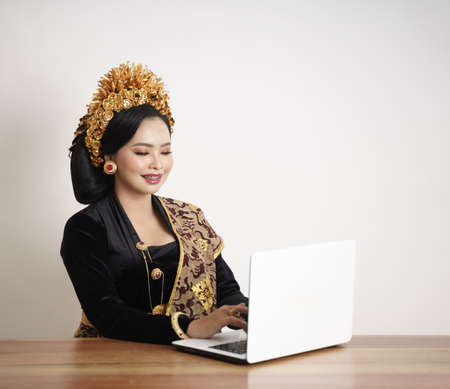 Smiling balinese woman wearing traditional clothes showing digital tablet