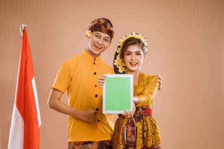 man and woman wearing balinese traditional clothing using tablet pc and smiling