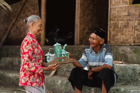 An elderly couple joyfully shares a beautiful moment together over traditional tea