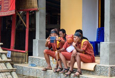 Tana Toraja, Indonesia - Dec 10, 2015: Unidentified group of people in traditional clothes at funeral ceremony. In Toraja the funeral ritual is the most elaborate and expensive even